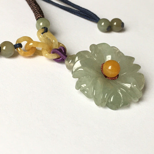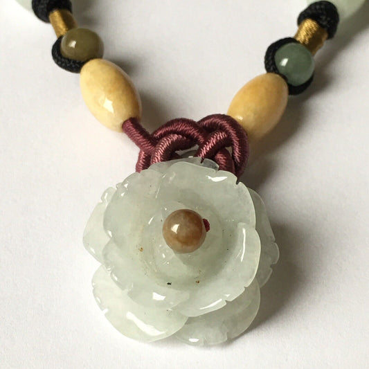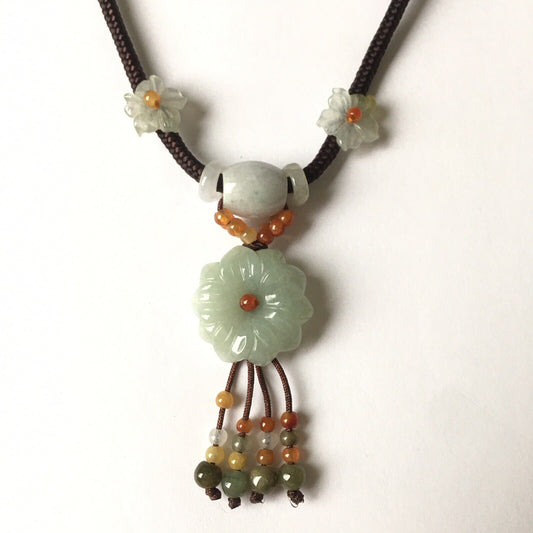 Macrame Handmade Genuine Carved Flower Jade Necklace adjustable 16~24”