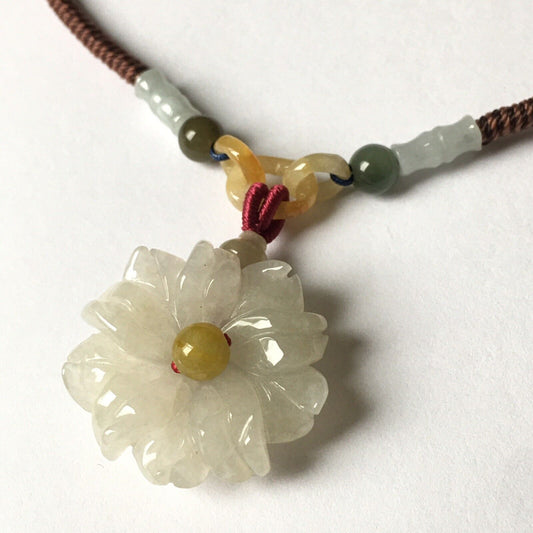 Macrame Handmade Genuine Carved Jade Flower Necklace adjustable 16~24”