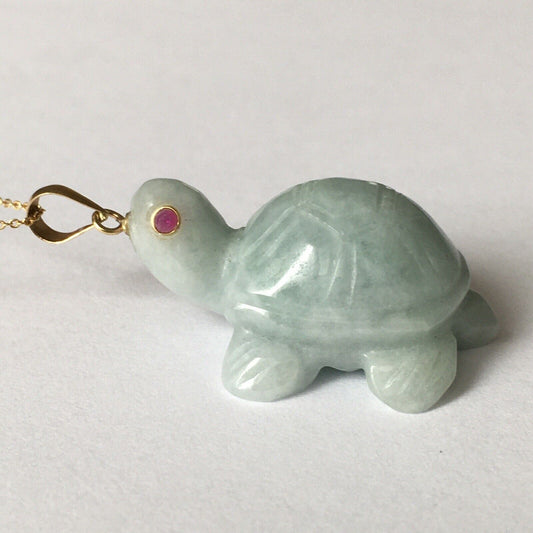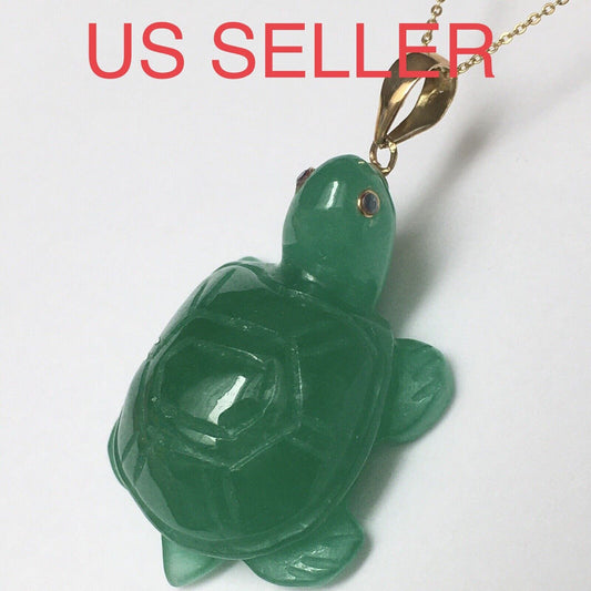 14k Solid Yellow Gold Natural Green Jade Turtle Pendant Ruby Eyes Hand Carved