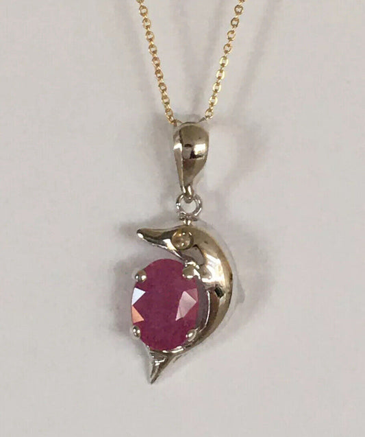 P-0560 New 14k Solid White Gold Genuine Oval Ruby Pendant With Diamond Dolphin