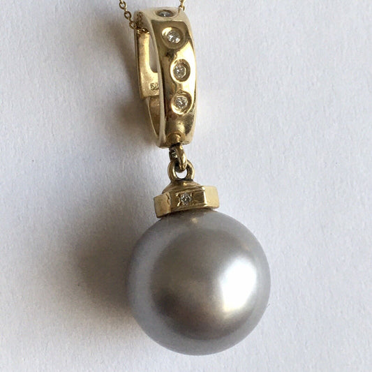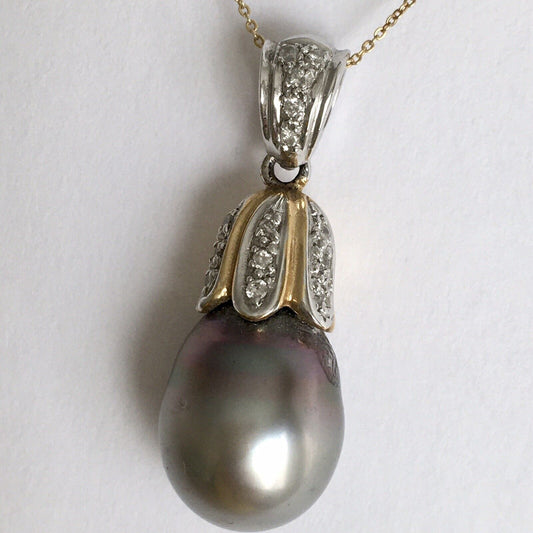 New 18k Solid Yellow Gold Y/G Natural Gray South Sea Pearl Diamonds Pendant