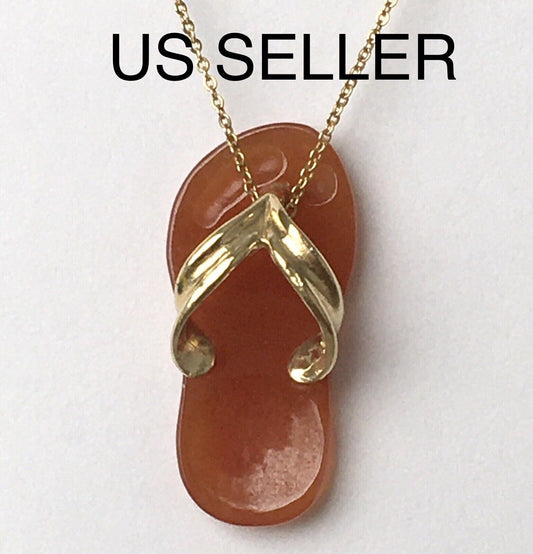 New 14k Solid Yellow Gold Brown Red Jade Pendant Good Luck Flip Flop