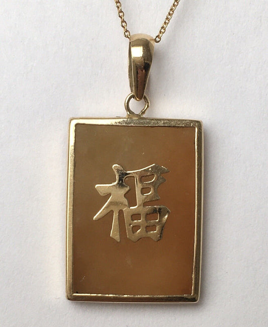 New 14k Solid Yellow Gold Brown Yellow Jade Pendant “Happiness” Good Luck 2.5G