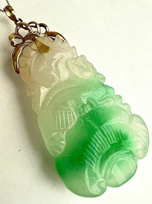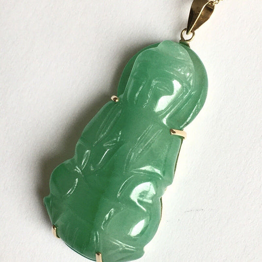 New 14k Solid Yellow Gold Natural Green Jade Pendant Lucky Guanyin Buddha 22.1g