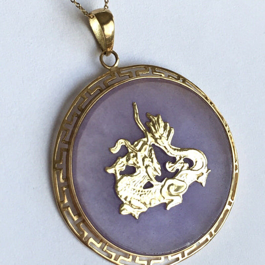 14k Solid Yellow Gold Circle Natural Lavender Jade Pendant Dragon Long Life 5.6g