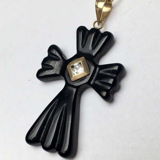 New 14k Real Solid Yellow Gold Black Onyx Diamond Pendant Good Luck Cross