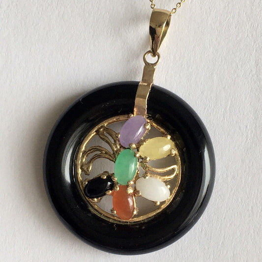 New 14k Solid Yellow Gold Circle Natural Multi Color Jade Onyx Flower Pendant
