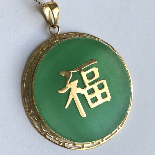 14k Solid Yellow Gold Circle Natural Green Jade Pendant Happiness Long Life5.6g