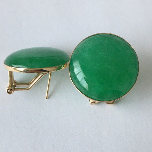 New 14k Solid Yellow Gold Natural Green Jade Earrings Good Luck 18mm French Clip