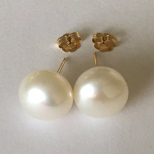 P-52011, New 14k Solid Yellow Gold Natural White Fresh Water Pearl Studs Earrings, 11mm
