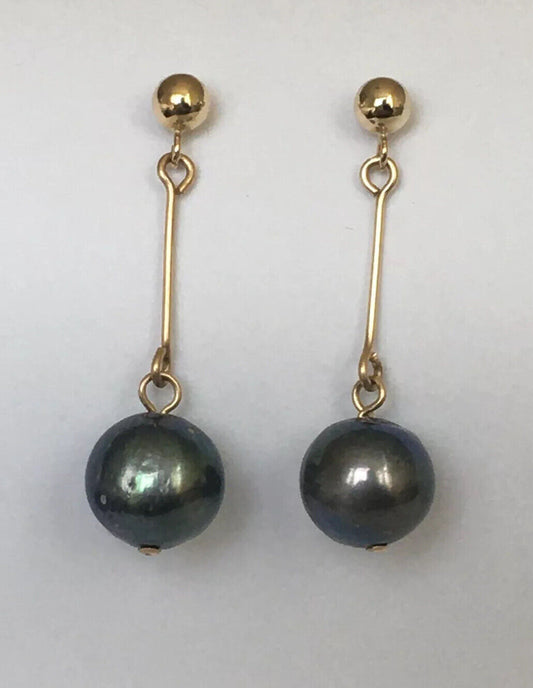 P-6151, 14k Solid Yellow Gold Natural Black South Sea Pearl Earrings Dangling