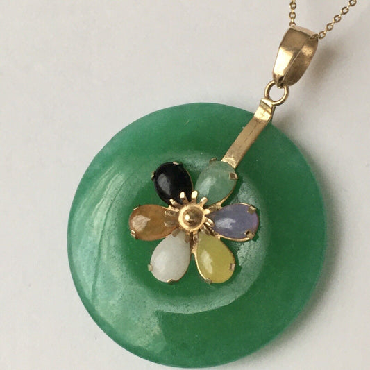 New 14k Solid Yellow Gold Circle Natural Multi Color Jade Flower Pendant Lucky