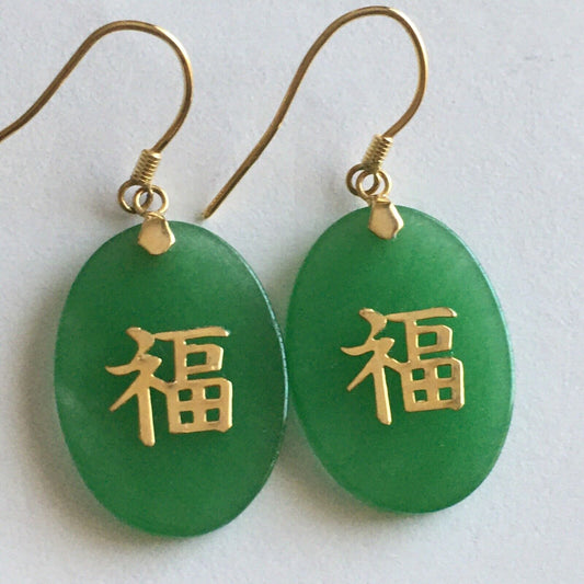 New 14k Solid Yellow Gold Natural Green Jade Earrings “Happiness” Good Luck 3.2g