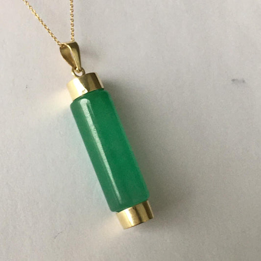 New 14k Solid Yellow Gold Quality Natural Green Jade Cylinder Pendant Good Luck