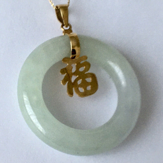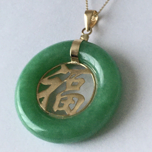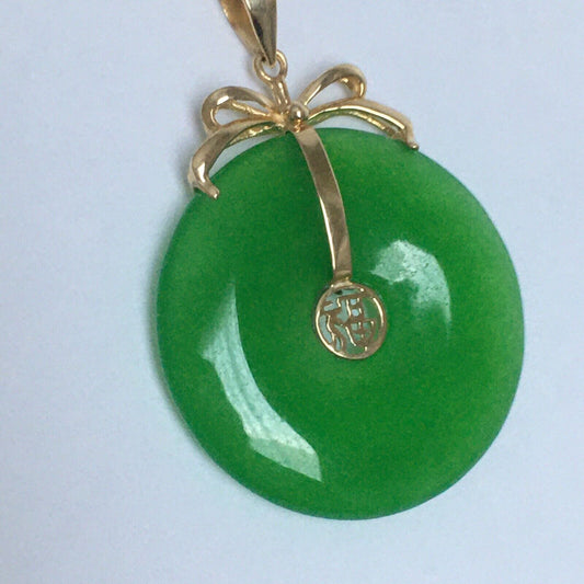 14k Solid Yellow Gold Big Circle Natural Green Jade Pendant Lucky Happiness 9.1g