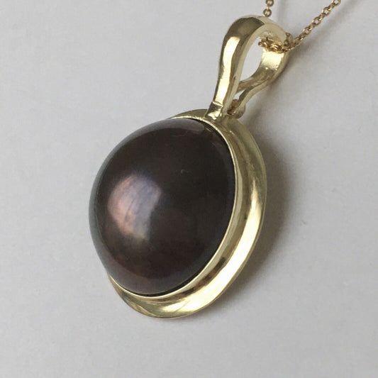 New 14k Solid Yellow Gold Y/G Natural Black Mabe Pearl Pendant 2.5g
