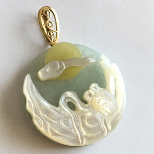New 14k Solid Yellow Gold Natural Green Jade Mother of Pearl Pendant Lucky Lady Buddha 13.6g