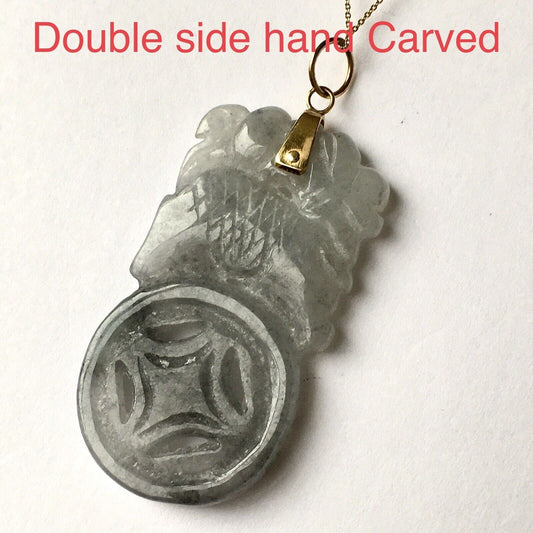 14k Solid Yellow Gold Big Green Jade Pendant Hand carved Good Luck Fish 16.0g