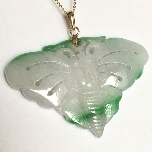 New 14k Solid Yellow Gold Natural White Green Jade Pendant Good Luck Butterfly